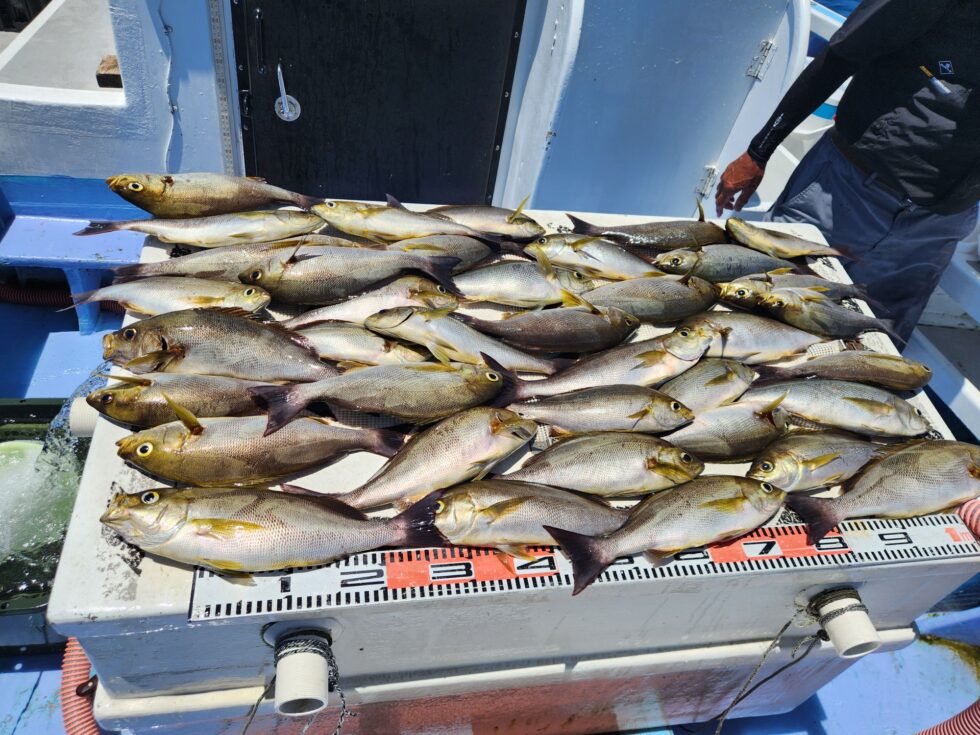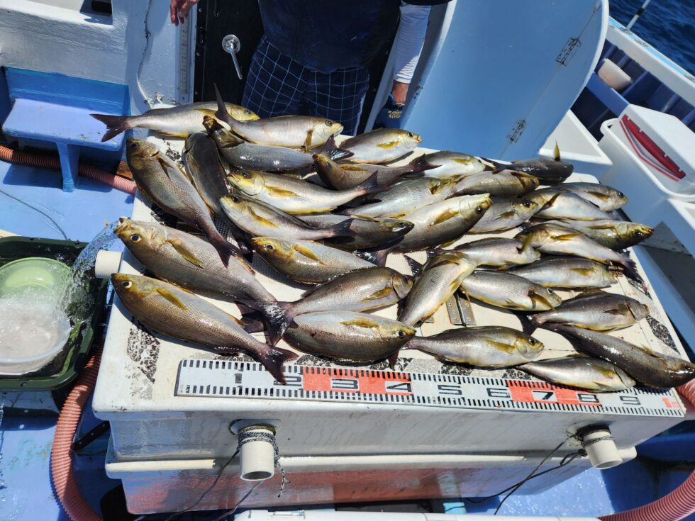大山沖ジャンボイサキ入れ食い中!10時頃早々にクーラー満タンの方もありで今日も凄い1日でした。まだまだ大山沖へジャンボ狙いで出船ですよ!