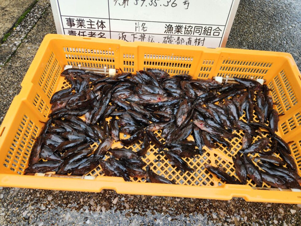 午後からはヒラメ稚魚、キジハタ稚魚、カワハギ稚魚を片名前に放流しました!
