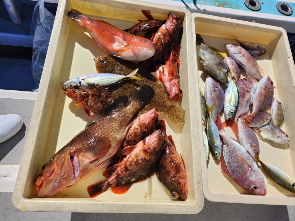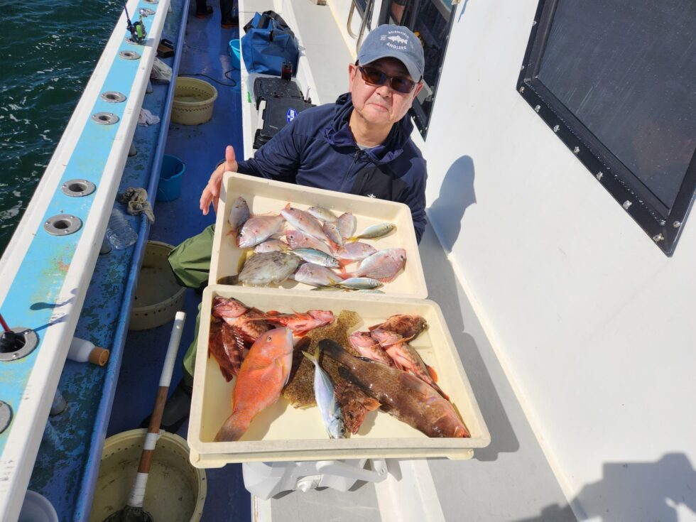 活きウタセエビ五目爆発っ!多彩な釣果で初心者さんからベテランさんまで楽しめました。活きウタセエビたっぷり入荷中ですよ!