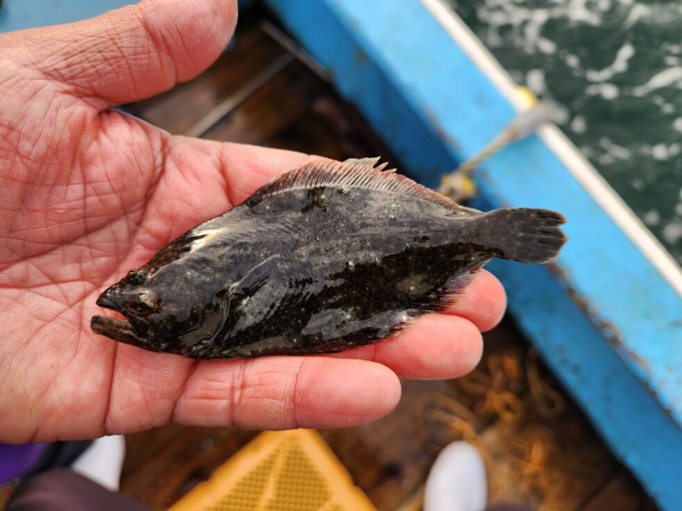 午後からはヒラメ稚魚、キジハタ稚魚、カワハギ稚魚を片名前に放流しました!