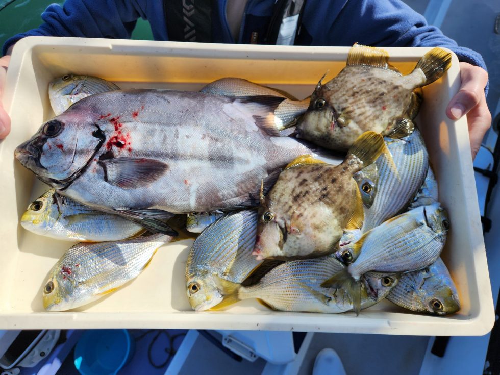 イシダイ、サンバソウ、ハマチ、クロダイ、小鯛、ヘダイ、カワハギ、カサゴ