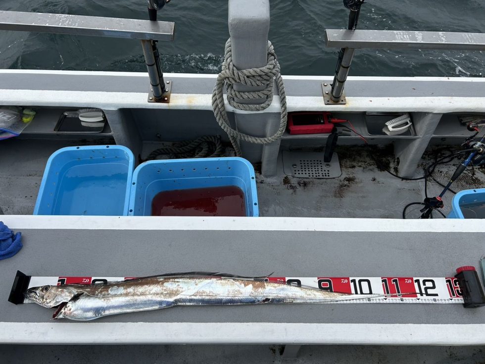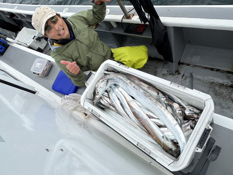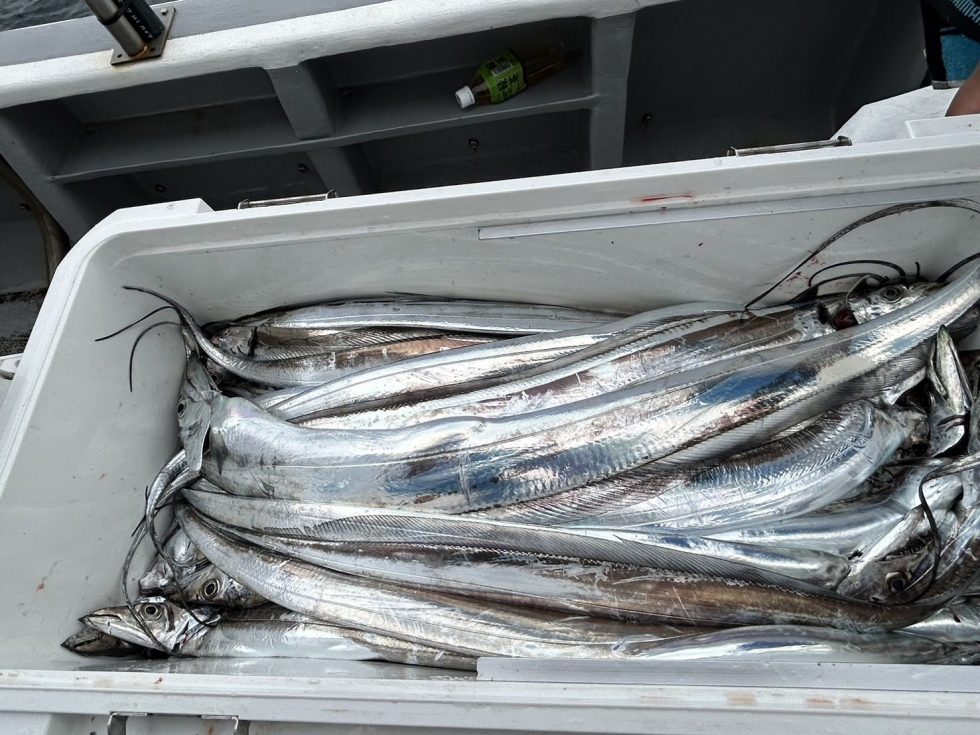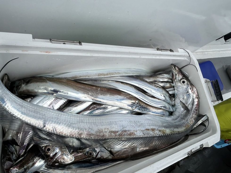 テンヤタチウオ専門で今日も爆釣ー!少し難易度高めでゲーム性高くなり釣り人を熱くさせますよ!明日(土)も空き多数、朝の飛び入り大歓迎ですよ