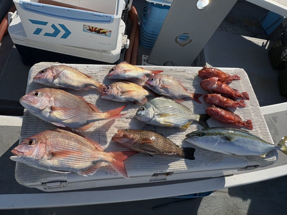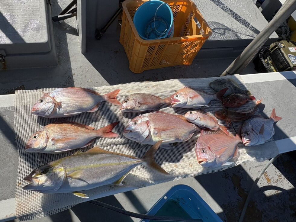 一つテンヤ真鯛船!絶好調ー!イシグロ西尾店フィッシングマイスターお見事!
