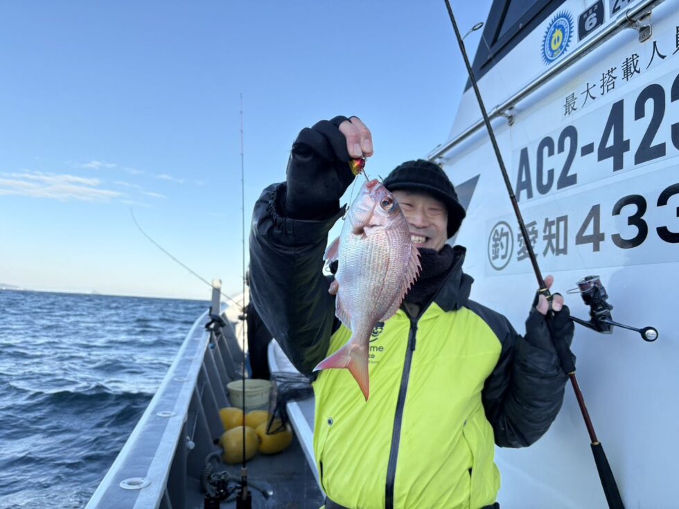 伊勢湾一つテンヤ真鯛絶好調ー!今日は釣具のイシグロ西尾店さん、シマノ大守さんも遊びにいらしてくださいました!